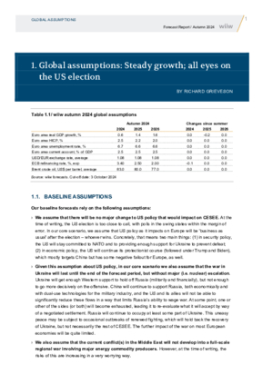 We assume that there will be no major change to US policy that would impact on CESEE, that the war in Ukraine will last until the end of the forecast period, that the current conflict(s) in the Middle East will not develop into a full-scale regional war involving major energy commodity producers, and that central banks will continue their monetary easing cycles. Under these conditions, the global economy should continue its steady, if underwhelming, growth during the forecast period. However, the weakness of the German economy in general, and of German industry in particular, is a serious issue for CESEE.