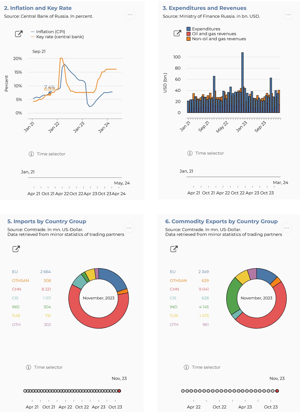 A wide selection of figures in a new database on the impact of Western sanctions on the Russian economy. The indicators are available in time series from 2021 to April 2024 and are presented as interactive graphs/charts. For more information click here.