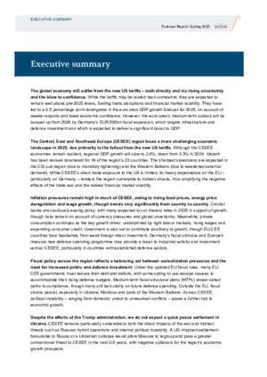 US tariffs on the rest of the world will be considerably higher than before Donald Trump took office for the second time. Germany’s fiscal U-turn is serious and will have material positive economic spill-overs for CESEE, mainly from 2026. The war in Ukraine will not end soon, but will gradually move towards at least a ceasefire during the forecast period.