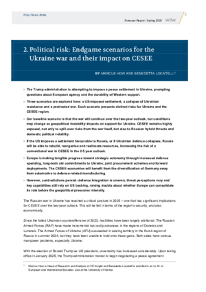 The Trump administration's push for a peace settlement in Ukraine raises concerns about European agency and sustained Western support, with three scenarios under consideration—a US-imposed deal, a Ukrainian collapse, or a prolonged conflict—each posing distinct risks for Ukraine and the CESEE region. The baseline outlook assumes continued warfare over the next two years, though shifting geopolitical dynamics may alter levels of support. CESEE remains vulnerable not only to direct spillovers from the war but also to Russian hybrid threats and internal political instability. A settlement favouring Russia or a Ukrainian collapse would allow Moscow to regroup, heightening the risk of conventional conflict in CESEE over the 2–5 year horizon. While Europe is advancing strategic autonomy through defence investments, aid to Ukraine, and industrial shifts—especially in Germany—progress is uneven, and reliance on US capabilities casts doubt on Europe's ability to solidify its role amid growing geopolitical pressures.