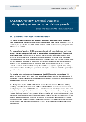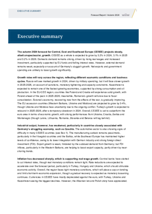 Our autumn 2024 forecast shows that the trends identified in the summer remain broadly the same, with a decent, but unspectacular, recovery across most of the region. We expect CESEE as a whole to grow by 3.2% this year, 3.1% in 2025 and 3.2% in 2026, in all cases barely changed from the 3.2% expansion of 2023. The composition of growth in CESEE remains unbalanced, with domestic demand performing strongly, but external demand still weak, on account of low or negative growth in Germany and other key partners. Our projections indicate a very solid outlook for convergence in CESEE over the forecast period. Most countries of the region will comfortably outperform the euro area both this year and in 2025-2026.